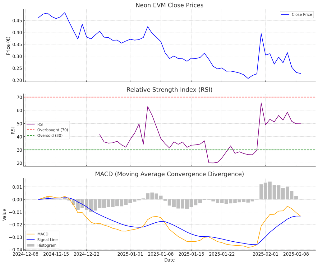 • Nykyinen tila: RSI on pysytellyt välillä 30–50, mikä tarkoittaa, ettei Neon EVM ole vielä ylimyyty tai yliostettu.